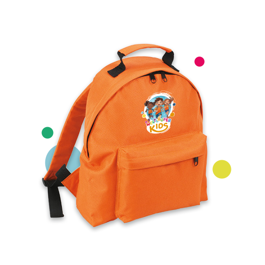 Unser orangefarbener Kinder-Rucksack ist ideal für alle Mini-Weltläufer:innen. Leicht, robust und mit coolem Logo – optional direkt zur Anmeldung dazubuchbar.